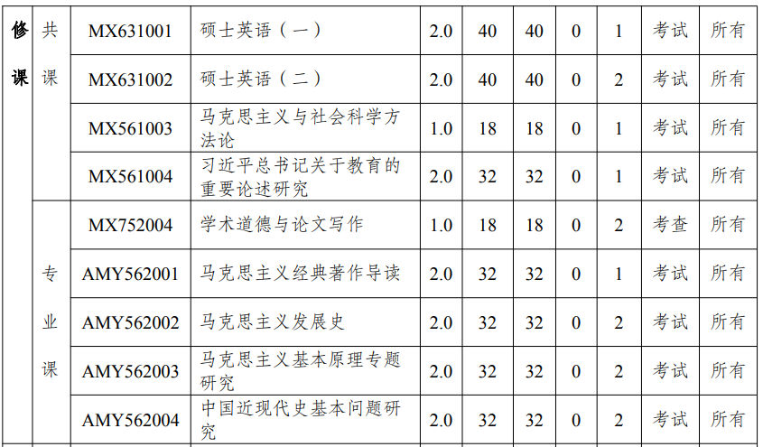 马克思主义理论硕士研究生达到毕业标准的课程总学分不少于 33 学分。 必修课不少于 17 学分,其中,公共必修课包括政治理论课不少于 5 学分、 英语不少于 4 学分;专业必修课不少于 8 学分。 公共选修课及专业选修课 12 学分,实践培养环节 4 学分(包括科研创 新与实践能力培养 2 学分、学术活动 1 学分、文献阅读 1 学分、体育美育 和劳动实践教育等)。跨专业和以同等学力入学的研究生,须补修本方案指定的本科生必修课至少 2 门课程,考核成绩合格,不计学分。