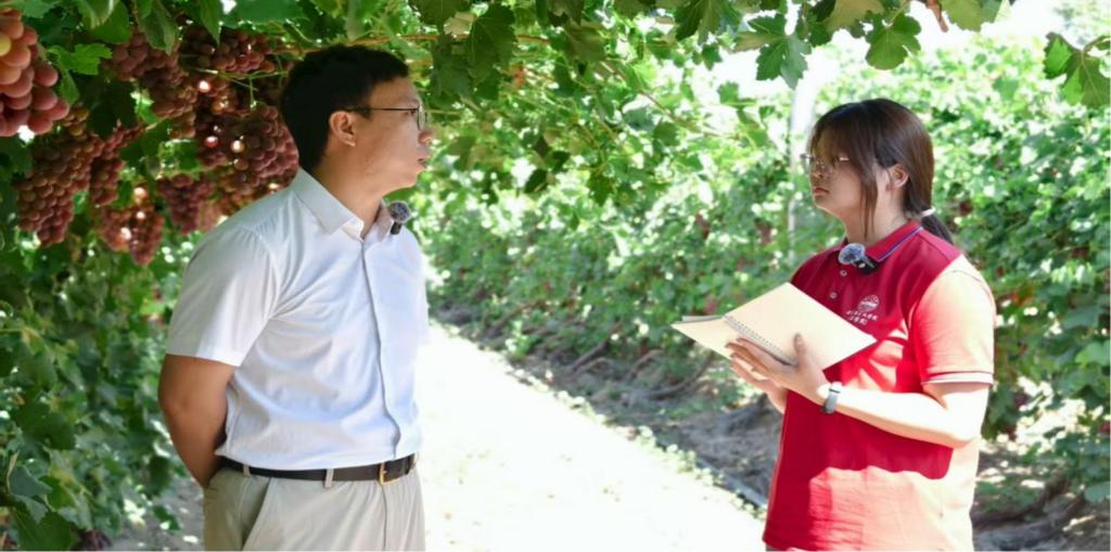 8月22日上午,实践团成员来到共青团农场四连农户自家葡萄藤地与干部解子藤进行采访,他结合农场电采暖改造工程介绍,农场党委以党建引领推进该民生项目,解决民生采暖的诸多问题,让群众深切感受共青团农场的深切关怀。